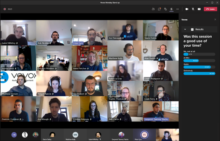 For larger audiences, or to encourage quieter or less confident colleagues to contribute, the use of a Live polling and Q&A platform like Vevox allows anonymous questions (which can be upvoted by other audience members) to be submitted and opinion and knowledge to be gauged through instant polls.
