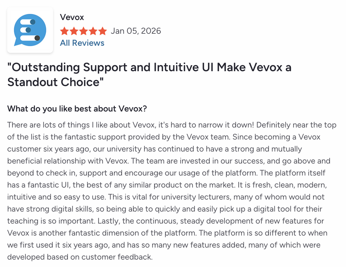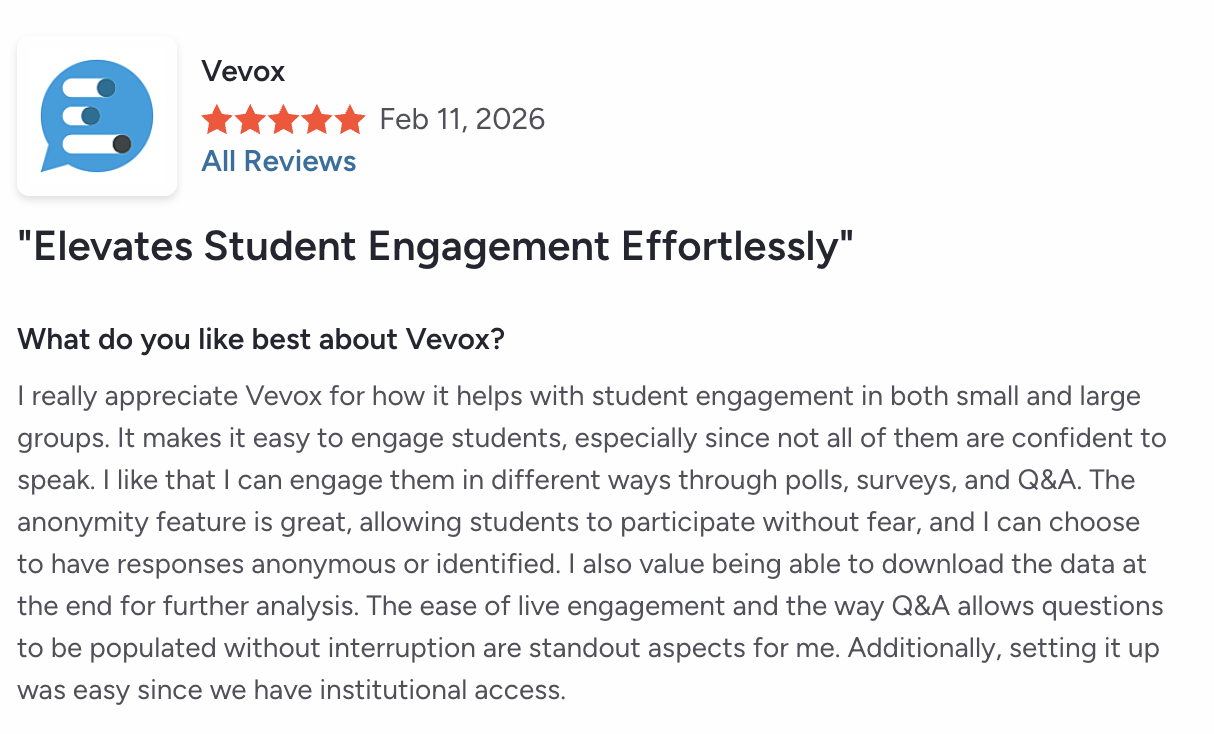 This recognition reflects Vevox’s continued mission to empower educators and organizations to make every voice heard, improving engagement, inclusivity, and learning outcomes through simple, powerful technology. Over the past year, Vevox has received hundreds of verified 5-star reviews, with users consistently highlighting: